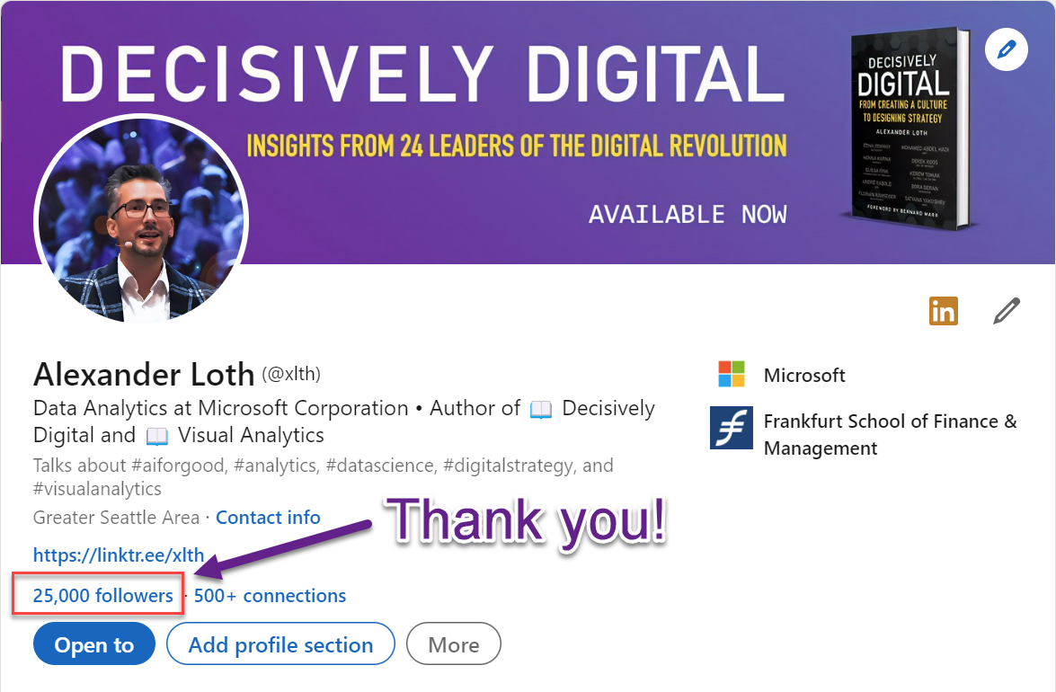 My LinkedIn profile when reaching 25,000 followers. Thank you very much!